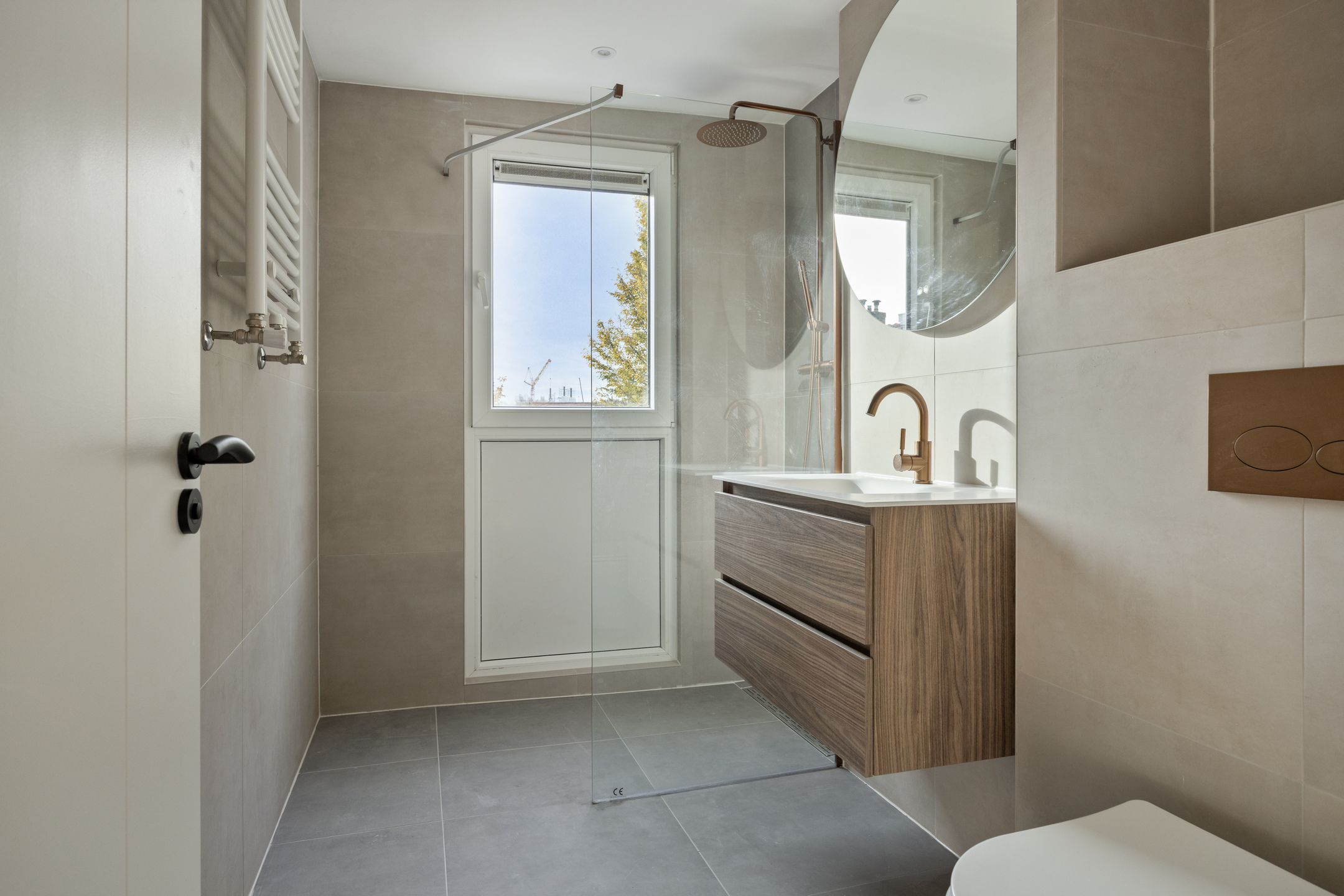 . Deze sfeervolle ruimte is volledig afgewerkt en voorzien van een moderne vloer met vloerverwarming, strak gestuukte wanden en plafonds.
