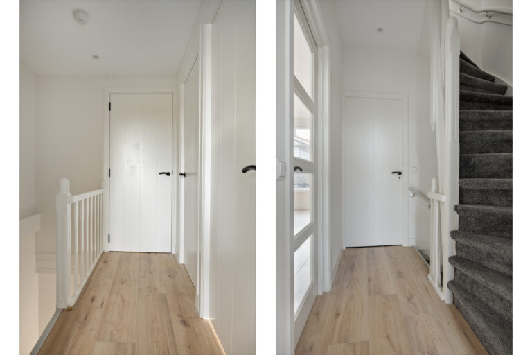 Trapopgang naar de slaapverdieping. Overloop met toegang tot 2 royale slaapkamers, berging/wasruimte en heerlijk luxe badkamer. Ook is er een balkon aan de achter gelegen slaapkamer aanwezig.